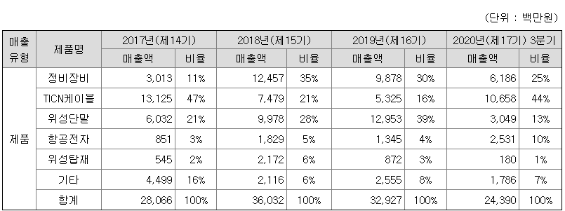 정비장비, TICN케이블, 위성단말이 주 매출원입니다.